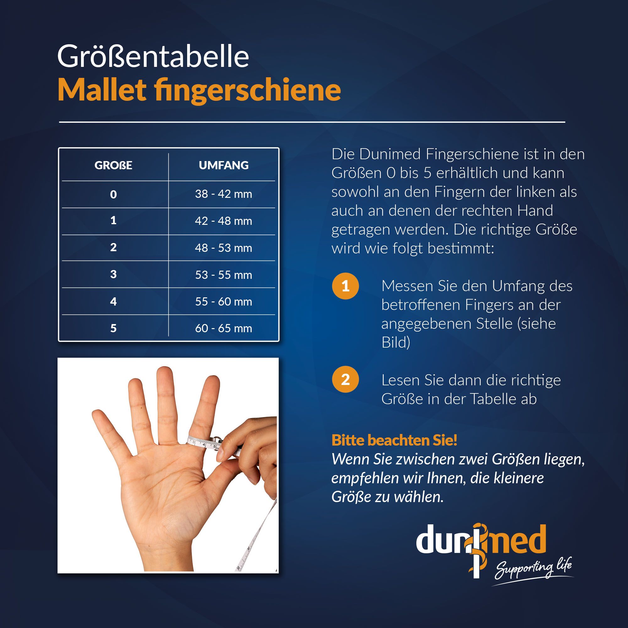 Die Dunimed Mallet Fingerschiene ist für alle Finger geeignet und in den Größen 0 bis 5 erhältlich. So können Sie immer die Größe wählen, die am besten zu Ihrer Hand passt. Die Schiene lässt sich schnell anlegen und schränkt die anderen Finger nicht ein.