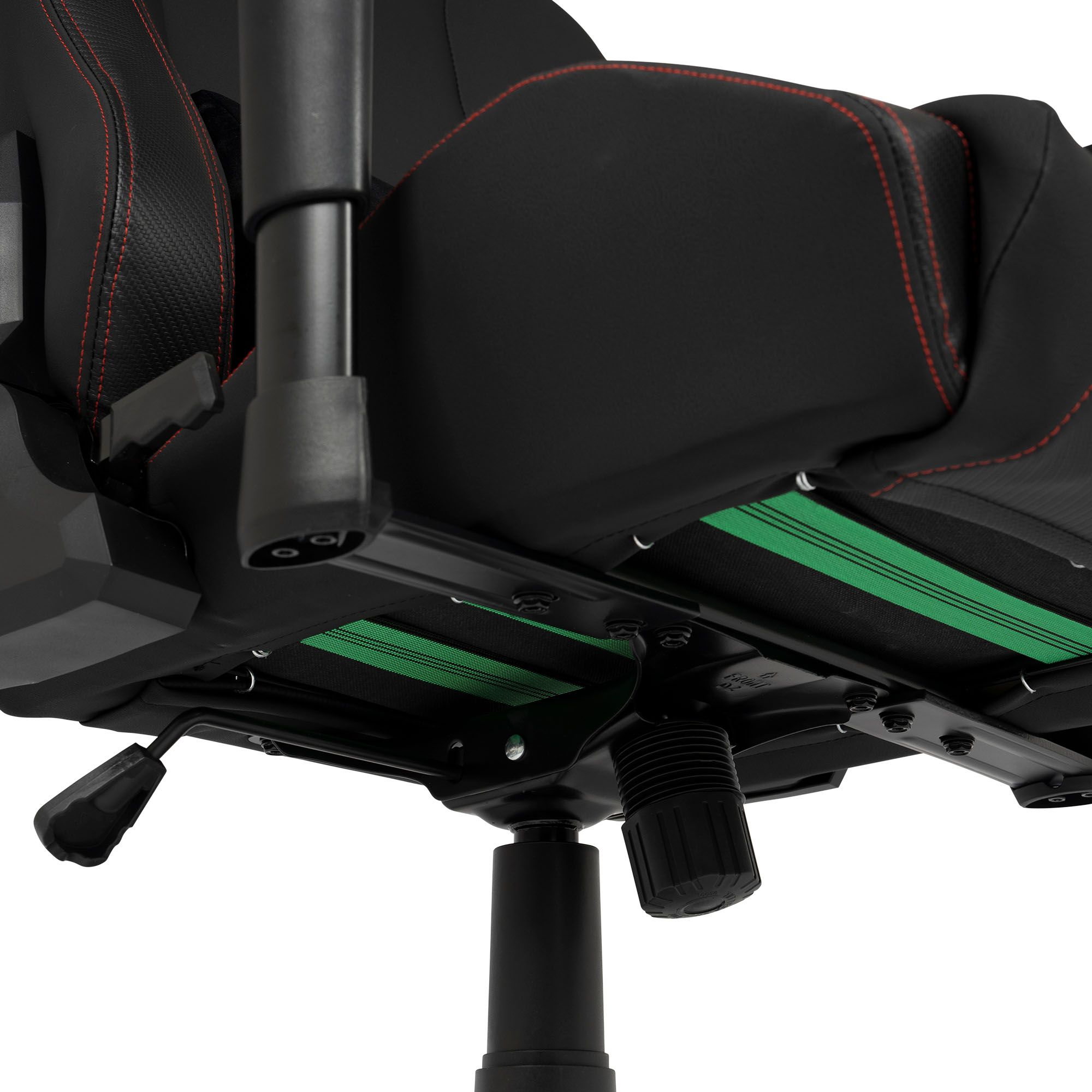 Dank des ergonomischen Designs des Gaming-Stuhls sitzen Sie auch bei langen Gaming-Marathons bequem und verantwortungsbewusst. Durch das Gasfedersystem ist der Stuhl stufenlos von 46 bis 52 cm höhenverstellbar. Der Stuhl ist daher am besten für Personen ab 1,65 m geeignet. Mit dem Knopf auf der Unterseite können Sie den Widerstand des Kippmechanismus einstellen.