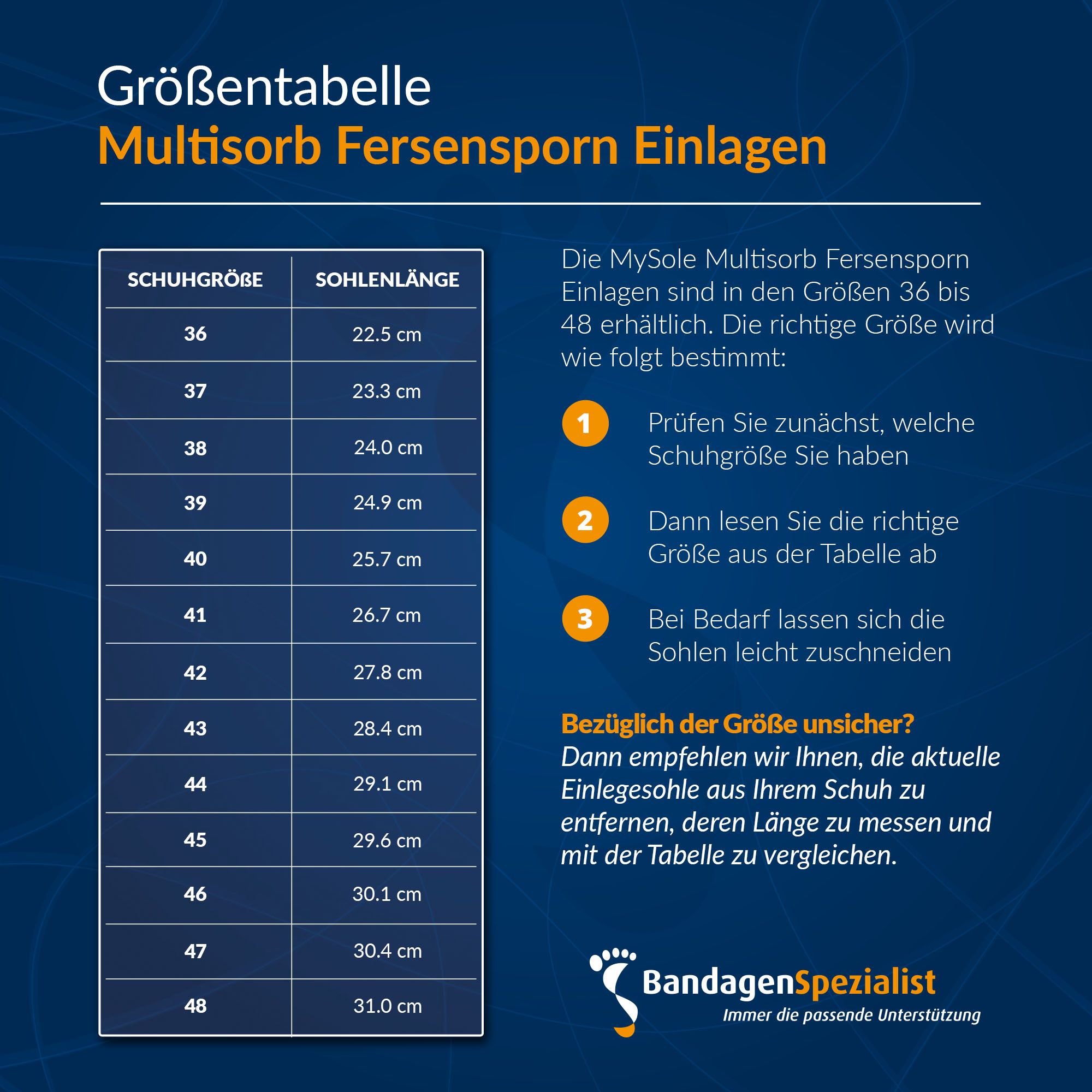 Ob Sie Beschwerden lindern oder vorbeugen möchten, die Multisorb-Einlagen ist für alle Fußtypen geeignet. Diese beliebte Einlagen wird häufig bei starker Belastung, beim Sport oder bei der Arbeit verwendet und wird von Therapeuten speziell bei Fersen- und Sehnenbeschwerden empfohlen.