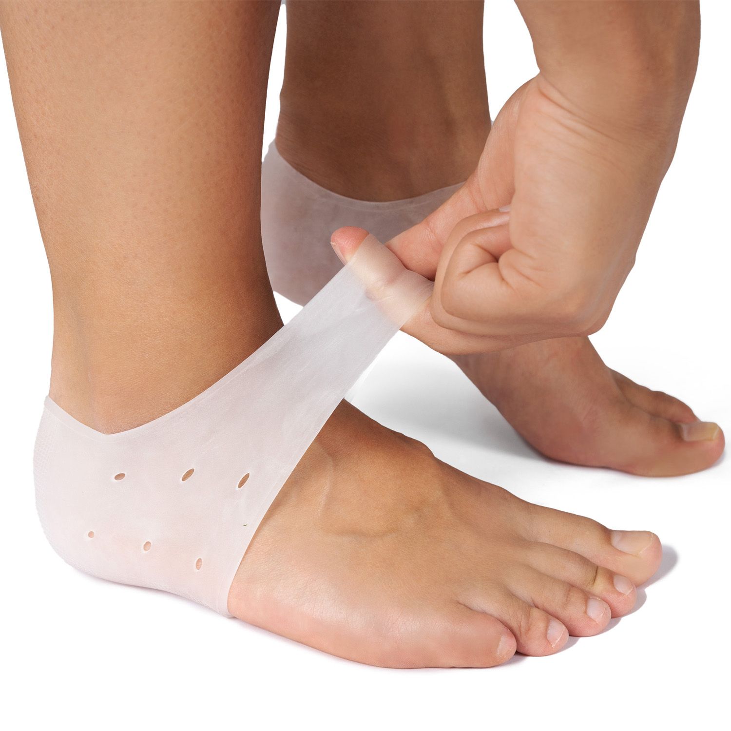 Langes Stehen und Gehen kann Fersenbeschwerden verursachen. Der hochmoderne Fersenschutz aus weichen Silikon reduziert den Druck des Körpergewichtes auf der Ferse – entlastet also die Ferse – und lindert den Schmerz.