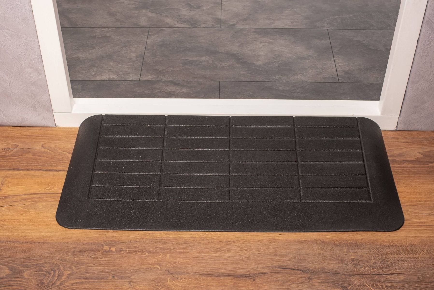 Der Vorteil dieses Modells sind die schrägen Seitenflächen. Dadurch können Sie die Türschwellenrampe aus jedem Winkel hochfahren. Diese schrägen Seitenflächen verringern auch die Sturzgefahr. Wir können die Türschwellenrampe in Höhen von 1,5 cm bis 7,5 cm liefern. Die Schwellenhilfe 1,5 cm kann dank des Gummis sowohl im Innen- als auch im Außenbereich verwendet werden. Die Türschwellenrampe hat dünne Rillen für maximalen Halt. Außerdem ermöglicht sie einen besseren Wasserabfluss.